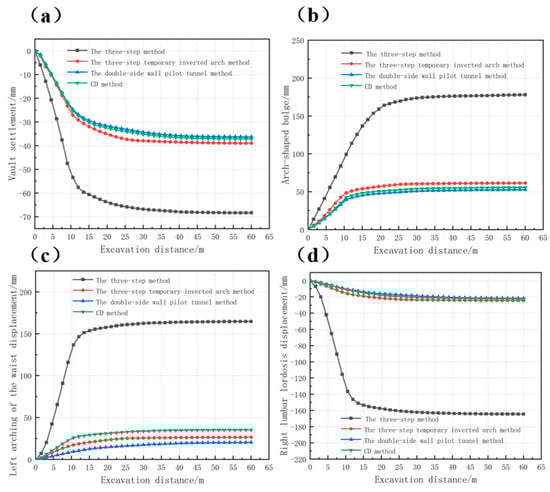 The deformation curves of each key position of the tunnel rock mass surrounding the tunnel with respect to the excavation length: (a) vault settlement; (b) arch-shaped bulge; (c) left arching of the waist horizontal displacement; (d) right arching waist horizontal displacement.