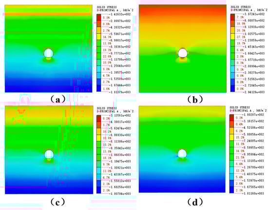 Examining the stress state within the rock mass surrounding the tunnel after tunnel excavation is crucial for assessing construction methods. This analysis aids in identifying stress variations in the rock mass surrounding the tunnel during excavation, which is critical for assessing rock stability and determining support requirements. It offers a scientific foundation for choosing and refining construction techniques, ensuring construction safety and quality. Additionally, understanding the stress distribution aids in controlling rock deformation and minimizing environmental impact, forming a crucial foundation for efficient and safe construction. Figure 6 displays the contour lines for the peak principal stress in the rock mass surrounding the tunnel for the four construction methods.