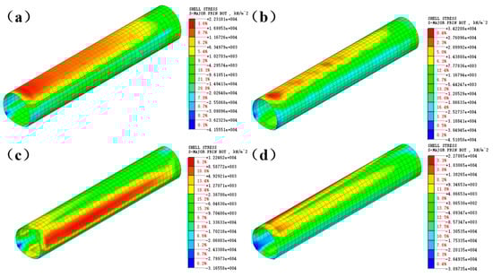 Stress cloud diagrams of the initial support after excavation using different construction methods: (a) the three-step method; (b) the three-step temporary inverted arch method; (c) the double-side wall pilot tunnel method; (d) CD method.