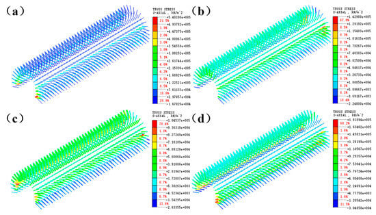Stress cloud diagrams of anchor rods after excavation using different construction methods: (a) the three-step method; (b) the three-step temporary inverted arch method; (c) the double-side wall pilot tunnel method; (d) CD method.