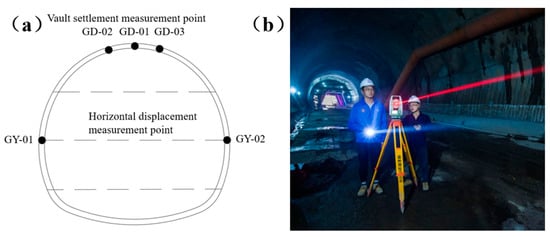 Tunnel monitoring and measurement: (a) monitoring point layout diagram; (b) on-site monitoring and measurement diagram.