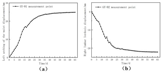 Additionally, horizontal convergence was measured at points GY-01 and GY-02 at the DK357+ 250 section, and the cumulative monitoring data over time were plotted in Figure 11.