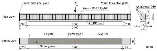 All beams tested in this study had a rectangular-shaped cross section with a width of 200 mm, depth of 250 mm, and clear span length of 3 m. The rebar arrangement is shown in Figure 1. The main rebar and stirrup arrangement, the treatment of the ends of the rebar, and the CFRP sheet bonding method for the beams were the same as those tested by Kishi et al. [20], and the paper can be referenced for details. The beams were strengthened by bonding a one-ply CFRP sheet up to near the supports to restrain the sheet-end debonding. Also, any countermeasure treatment for restraining the sheet debonding was not applied because of investigating the failure mechanisms of the beams including IC debonding of the sheet and/or the sheet rupturing under the impact loading.