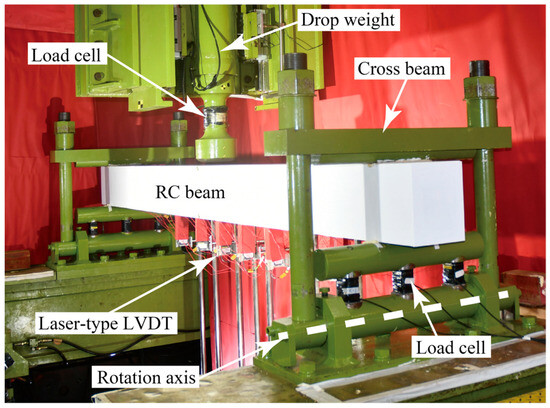 Drop tests were carried out on the beams by freely falling a weight from a predetermined height onto the midspan of the beam using an impact loading apparatus (Kishi et al.) [20,31,32], as described in Figure 2. A 300 kg weight was applied as an impactor. The supports of the beam can freely rotate to be pinned, and the horizontal displacements at the supports are restrained through tightening with the cross beams.