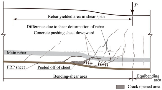 The experimental results showed the following: (1) that IC debonding failure did not always occur in the pure bending region; (2) however, it could occur in the intermediate rebar yielded area in the shear span, as shown in Figure 3; and (3) the sheet was debonded owing to the peeling action of the tips for the diagonal cracks (hereafter referred to as peeling action of the diagonal cracks) that developed where the intermediate rebar yielded.