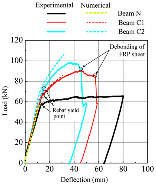The experimental results of the rebar-yield load and the maximum load for the three beams are indicated in Table 3. In this table, the maximum load of Beam N was taken at the point when the beam deflected by approximately δ = 30 mm because the strengthened beams approximately reached the calculated limit state at the deflection level. The table indicates that due to strengthening with the CFRP sheet, the rebar-yield load and the maximum load of Beam C1 were 15% and 46% greater than those of Beam N, respectively. In the case of Beam C2, even greater results were obtained than those of Beam C1 because of a larger amount of the sheet volume.