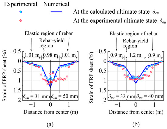 From the experimental strain distributions of the sheet at the deflection δeu described in Figure 5, the strain plateau in the midspan area spread toward the supports for both beams. In terms of Beam C1, the strain values in the plateau were mainly distributed around 1%, which was less than the failure strain of the sheet εuf (=1.39%). Since the width of the plateau on the right-hand side was larger than that on the left-hand side, the sheet debonding might have started closer to the support in the intermediate area of the right-hand side of the beam owing to the peeling action of the diagonal cracks. In terms of Beam C2, the strains distributed in the plateau were smaller than those of Beam C1 and less than 1%. This may have been due to the sheet gradually debonding. Additionally, stepwise plateaus were formed on both sides of the beam. However, the plateau on the right-hand side was slightly wider than that on the left-hand side.