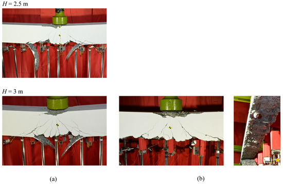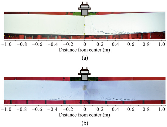 Crack patterns immediately before sheet debonding: (a) Beam C1 and (b) Beam C2.