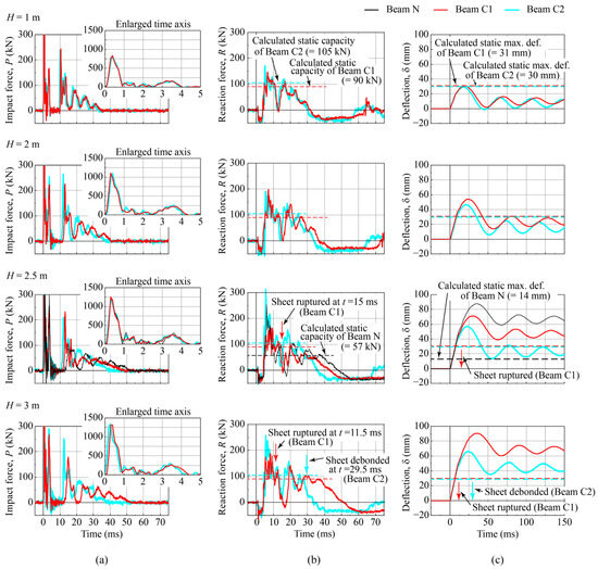 Even though Beam C1 collapsed in the sheet rupturing mode at drop heights H = 2.5 and 3 m and the sheet debonded for Beam C2 at H = 3 m, these behaviors could not be confirmed from the time records.