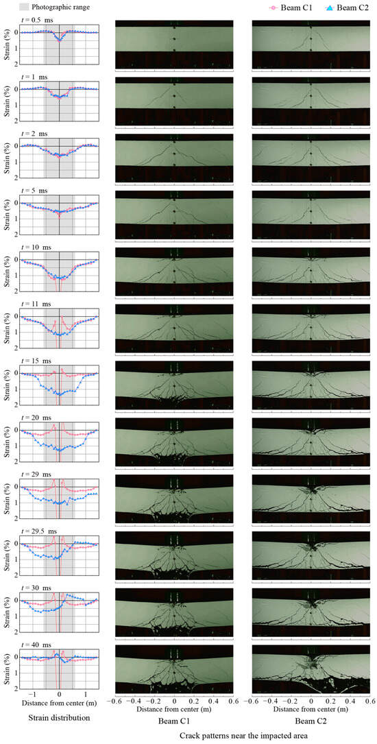 As shown in Figure 8, at time t = 0.5–2 ms after the start of impact (referred to hereafter as time t), the strain distributions for both beams showed that the tensile and compressive strains were distributed around the midspan area and the area near the support of the beams, respectively, the positive strain area extended toward the supports, and the negative strain area tended to decrease (Kishi et al. [20]). Regarding the case of Beam C1, the tensile strain near the loading area reached 0.5% at time t = 0.5 ms. However, at time t = 2 ms, the magnitude of the strain did not increase except near the midspan, and the area with a similar strain level expanded because it was after the time when the beam was subjected to the primary peak impact force with a 1 ms duration. The strain at the midspan gradually increased to approximately 0.75% at time t = 2 ms, while in the case of Beam C2, the strain distributions were similar to those of Beam C1 except near the midspan. Diagonal cracks formed in Beam C1 at time t = 1 ms. The flexural cracks slightly developed near the midspan in both beams. At time t = 2 ms, in the case of Bean C1, several diagonal cracks newly developed, whereas for Beam C2, only existing cracks were visible in the central area.