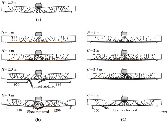 Figure 9 indicates the crack patterns for all specimens after impact load testing. In this figure, the bonded length of the sheet to the lower concrete cover was indicated. The following details were observed: flexural cracks developed over the whole span and from not only the lower fibers but also the upper fibers (Kishi et al. [20], Kishi and Mikami [31], and Hao et al. [37]). Furthermore, diagonal cracks occurred near the loading area, irrespective of whether the beams were upgraded by bonding the sheet or not and the amount of the sheet volume. The crack patterns that developed from the upper fibers might have been because of a flexural wave of a fixed beam traveling toward the supports at the start of impact, as mentioned above (Kishi et al. [20]). Beam N failed in the flexural-shear failure mode. However, Beam C1, which was strengthened by bonding the sheet, failed in the sheet rupturing mode, in which the sheet debonding occurred due to rebound of the rupturing sheet and was limited to the area near where the sheet ruptured. Beam C2 was strengthened by bonding the sheet with twice the volume of that of Beam C1 and failed by the sheet fully debonding because of the peeling action of the diagonal cracks previously mentioned.
