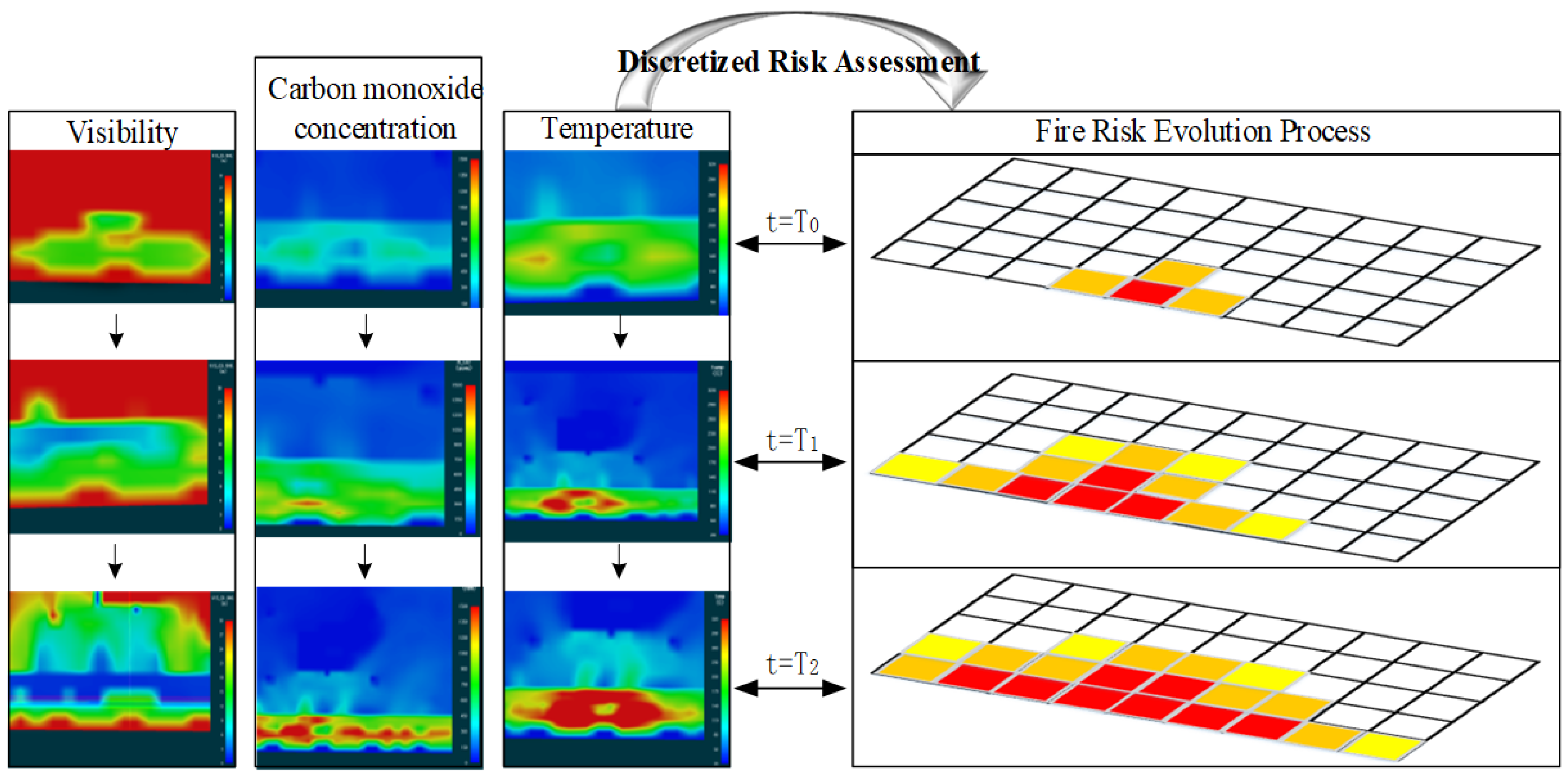 - A dynamic fire-risk evaluation model was developed. The model quantifies threat levels in a discretized environment using key parameters—ambient temperature, visibility, and toxic gas concentration—benchmarked against human-safety thresholds. This framework enables continuous, real-time updates of node-specific risk values as conditions evolve.