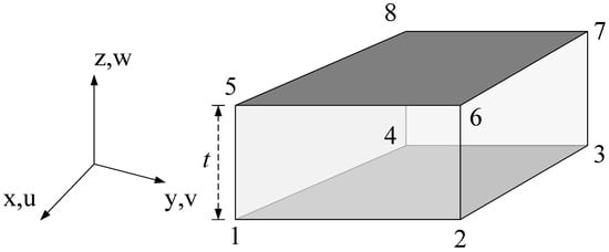 Eight-node element utilized in the CZM, t ≈ 0 (adopted from Camanho et al. []).