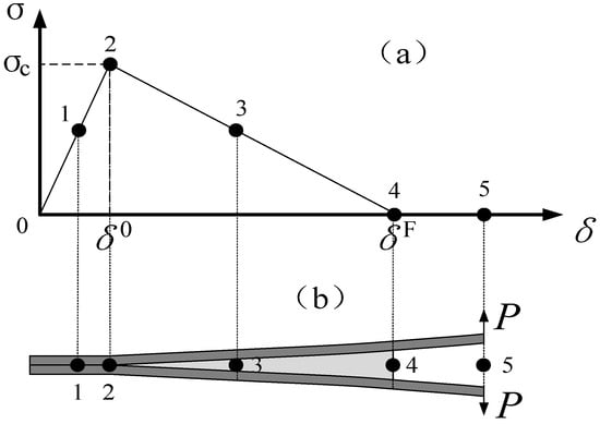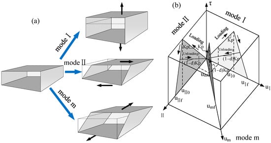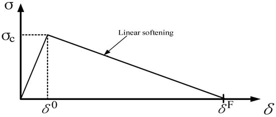 where Gi is the energy release rate for each specific mode; GiC is the fracture energy for each specific mode. When the equation is satisfied only in the case of failure, for the bilinear stress–displacement softening law, the critical energy release rates of mode I and mode II are equal to the area of the triangle in Figure 4b.