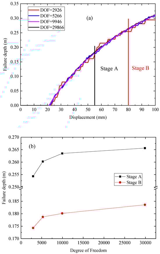 The computational results under different mesh refinement levels (varying degrees of freedom, DOF) are presented in Figure 5. As shown in Figure 5a, the results obtained with a coarser mesh exhibit pronounced sawtooth-like oscillations, which gradually diminish as the mesh refinement increases. Figure 5b demonstrates that the numerical solution converges with an increasing DOF, and reliable results are achieved when the DOF exceed 30,000.