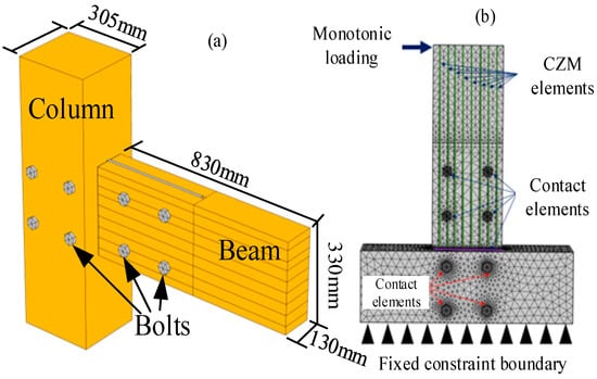 The contact element (penalty function) is applied between the beam and column, the glued laminated timber and bolt, and the glued laminated timber interface is simulated by the CZM element. In the test, the GLT specifications were Canadian spruce–pine–cold pine, and the measured water content was in the range of 10–12%. The specific mechanical properties of the specimens were assigned according to the experimental characterization by Wang et al. []. The material properties of the steel plate and bolt were selected according to Table 1.