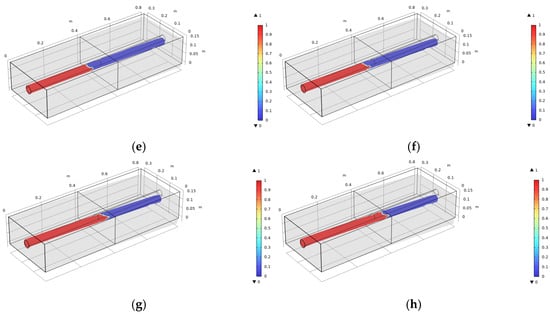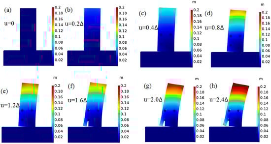 The displacement of GLT beam–column joints under monotonic loading (m), when the (a) loading displacement is 0; (b) loading displacement is 0.2Δ; (c) loading displacement is 0.4Δ; (d) loading displacement is 0.8Δ; (e) loading displacement is 1.2Δ; (f) loading displacement is 1.6Δ; (g) loading displacement is 2.0Δ; (h) loading displacement is 2.4Δ.