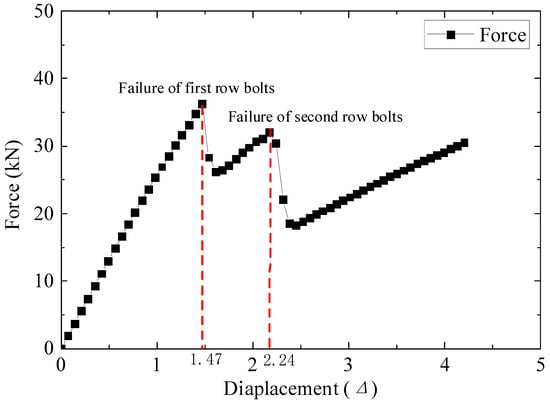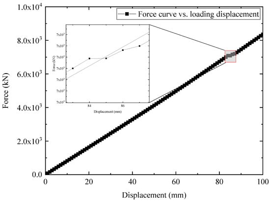 The model was subjected to monotonic loading up to a displacement of 100 mm. Figure 13a shows the corresponding failure contour plot of the reinforced concrete bonding interface when the loading displacement is 60 mm. When the loading displacement reaches 80 mm, the corresponding failure contour plot of the model is shown in Figure 13b. When the loading displacement reaches 100 mm, the corresponding failure contour plot of the reinforced concrete bonding interface is shown in Figure 13c. From Figure 13, it can be seen that when the loading displacement reaches 60 mm, the damage has not yet occurred (Figure 13a), while when the loading displacement reaches 80 mm, some of the ends of the steel bars are cracked (Figure 13b). Finally, when the loading displacement reaches 100 mm, almost all the ends of the steel bars are cracked and extended to a certain depth in the RC slab (Figure 13c). To quantitatively evaluate the relationship between loading and bonding interface failure, the calculated force curve vs. loading displacement is plotted in Figure 14. It can be observed from Figure 14 that the force–displacement curve exhibits typical quasi-brittle failure characteristics. In the initial stage of loading, the force increases linearly with the increase in loading displacement. However, when the loading displacement reaches 84 mm, a platform appears in the force–displacement curve. When the loading displacement is between 84 mm and 86 mm, the displacement continues to increase, but the required force remains unchanged. When the loading displacement is greater than 86 mm, the force continues to increase linearly with the increase in the loading displacement.