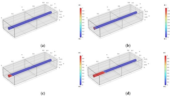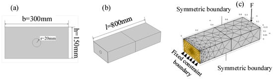 The geometric size of the reinforced concrete beam model is shown in Figure 9. The beam length, l, is 800 mm. The section size is b × h = 300 × 150 mm. The radius of the steel bar is r = 20 mm, and this is placed in the middle of the concrete beam. The material properties of the concrete and the steel bar are utilized according to Table 3. The material properties of the CZM interface are listed in Table 4.