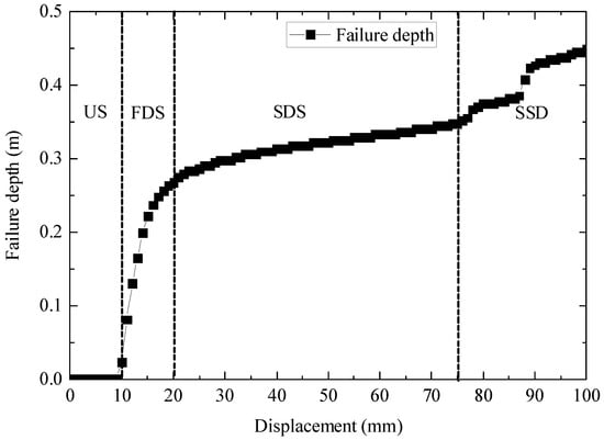The interfacial failure is governed by the following criterion: when the maximum separation displacement (δmax) exceeds the critical limit displacement (δmF), complete interfacial failure occurs, resulting in fracture and subsequent delamination. To quantitatively characterize this failure process, a reference line is established along the bonding interface. Progressive failure propagation is tracked through loading increments, and the failure depth is measured relative to the fixed constraint boundary. The relationship between the applied loading displacement and the corresponding progression in failure depth is presented in Figure 11. From Figure 10 and Figure 11, it can be observed that the failure depth curve illustrates the nonlinear advancement of damage. The failure depth curve can be divided into four stages according to its slope. Undamaged Stage (US): When the loading displacement is 0~8 mm, the maximum separation displacement δmax of the interface does not reach the limit displacement δmF, and the interface is intact without damage. Fast Developing Stage (FDS): When the loading displacement reaches 9 mm, the interface breaks for the first time. After that, when the displacement continues to increase to 20 mm, the failure depth increases rapidly to 0.25 m. Slow Developmental Stage (SDS): When the loading displacement increases from 20 mm to approximately 75 mm, the failure depth reaches 0.35 m, and the failure occurs slowly and evenly. Second Stage of Development (SSD): When the loading displacement is greater than 75 mm, the failure occurs relatively violently in this area and changes rapidly, as well as several step-like jumps appearing. When the loading displacement reaches 100 mm, the maximum failure depth is 0.449 m.