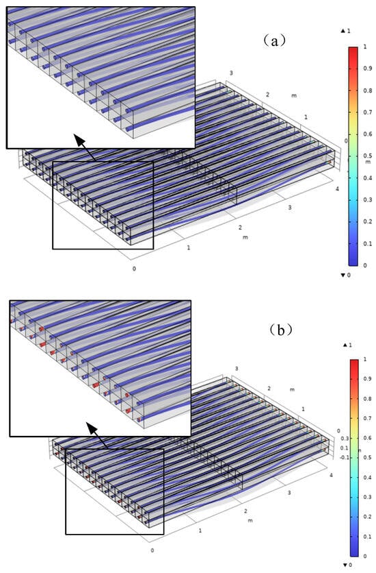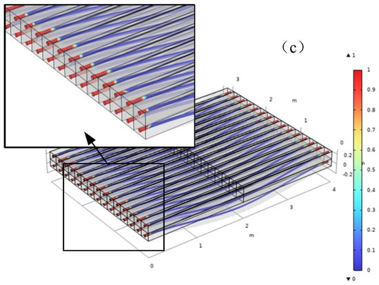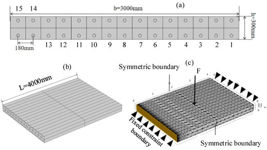 Based on the numerical model of the RC beam, an RC slab with a cross-section size of b × h = 3000 × 300 mm, a span of l = 4000 mm, a steel bar radius of r = 20 mm, and a spacing of a = 180 mm was established to observe and analyze the state of the reinforced concrete bonding interface under monotonic loading. The geometric size is shown in Figure 12a,b. The boundary conditions such as fixed constraints and roller supports were set on the reinforced concrete slab model. The finite element model with mesh is shown in Figure 12c.