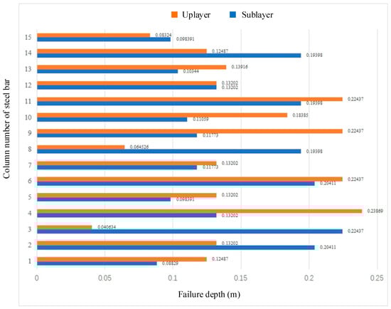 To discuss the spatial difference between the vertical and horizontal effects of the loading, the steel bar is divided into upper and lower layers, numbered 1~15 from left to right as shown in Figure 12a. The maximum failure depths of all the bonding interfaces are summarized in Figure 15 when the loading displacement reaches 100 mm. From Figure 13 and Figure 15, it can be observed that the bond interface of the reinforced concrete slab cracks from the fixed end on both sides to the middle under the action of the load. In all the failed bonding interfaces, the failure depth of the sublayer steel bar at the third steel bar layer is the largest, reaching 224.37 mm; the damage depth at the first steel bar layer is the smallest, which is 88.29 mm. The failure depth of the fourth steel bar layer of the upper layer steel bar is the largest, reaching 238.69 mm; the failure depth at the third steel bar layer is the smallest, which is 40.634 mm. In general, the degree of damage of the middle reinforced concrete bonding interface is greater than that of the left and right ends, indicating that the interfacial damage exhibits non-uniform distribution patterns, and the middle sections demonstrate more severe damage than the edge regions. The lower reinforcement layer shows a greater variability in damage, and the failure depth differentials suggest stress concentration effects.
