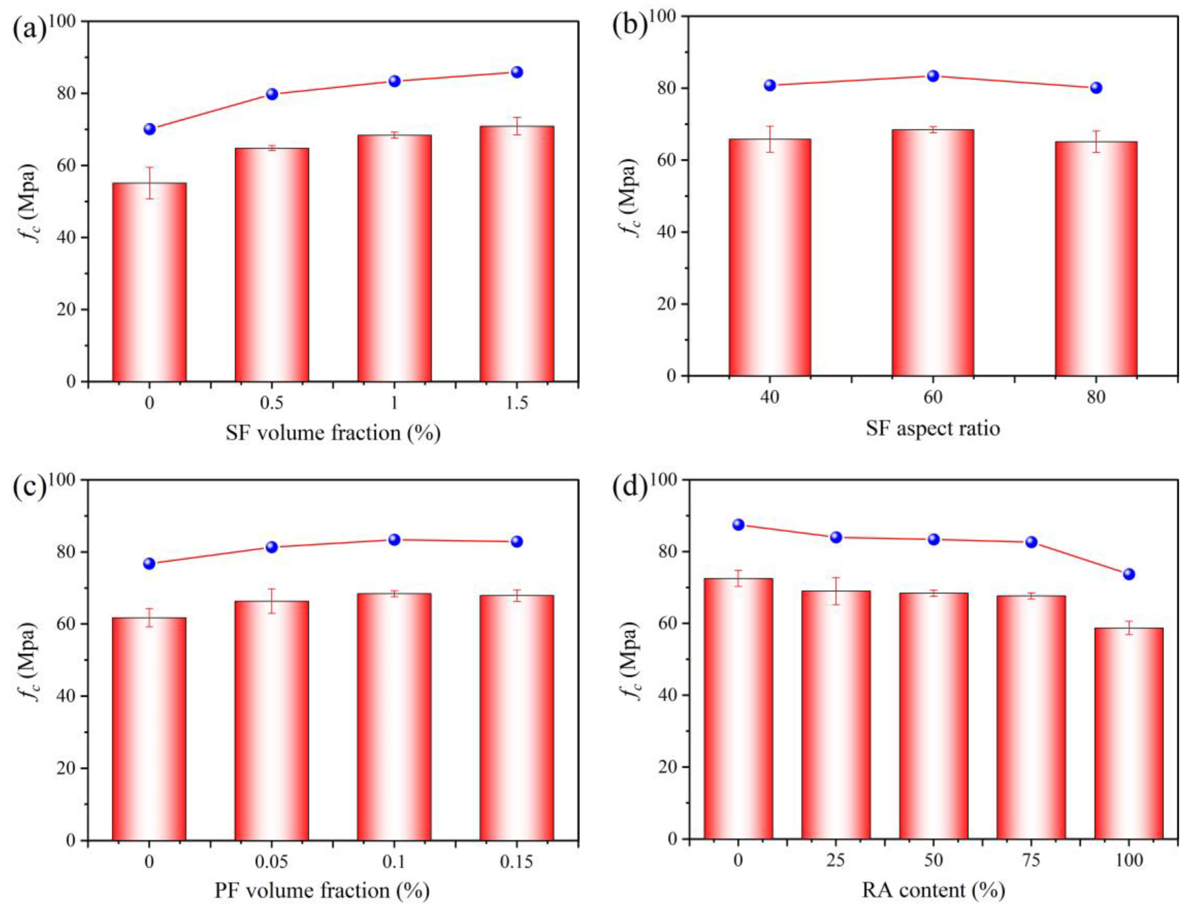 - The mechanical properties of HFRGRAC are significantly affected by hybrid fiber and RA parameters. Higher RA content negatively impacts compressive and splitting tensile strengths, reducing them by up to 21.21% and 12.61%, respectively. SF and PF enhance mechanical performance, with SF showing notably higher reinforcement efficiency than PF. The aspect ratio of SF has minimal influence.
