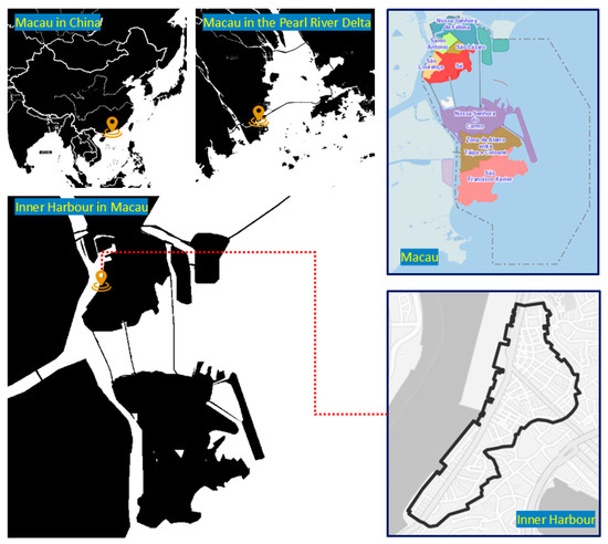 Macau is in the Pearl River Delta on the southeast coast of China, at 113°35′ east longitude and 22°14′ north latitude, about 60 km from Hong Kong in the northeast (Figure 1). Macau consists of Macau Peninsula (9.3 km2), Taipa Island (7.9 km2), Coloane Island (7.6 km2), Cotai Reclamation Area (6.1 km2), Zone A of the New District (1.4 km2), Zone C of the New District (0.3 km2), and Macau Administration Zone on the Artificial Frontier Island of Zhuhai-Macau of the Hong Kong-Zhuhai-Macau Bridge (0.7 km2) [45]. The Macau Peninsula pier district (mainly the Macau Inner Harbour) is one of the earliest urban areas established in Macau since its opening as a port. However, regarding the delineation of the Inner Harbour’s boundaries, Macau’s official historical records do not provide a clearly defined scope. The term “Inner Harbour” first appeared on maps in the 1962 Macau map, marked as “Port Interior”, where the geographic location corresponds to the western side of the Macau Peninsula. In 1834, a city and harbor map of Macau labeled the area as “Inner Harbour”, referring mainly to the coastal area south of Patane (沙梨頭) and along the western side of the peninsula. Historical maps document the continuous expansion of the Inner Harbour area over time [45]. The Inner Harbour Revitalization Plan received approval in 1990 and underwent continuous revisions thereafter. Based on available data, the Macau Peninsula pier district can be defined as the coastal port and harbor areas, as well as the mixed-use commercial and residential zones between Macau and Port City [46].