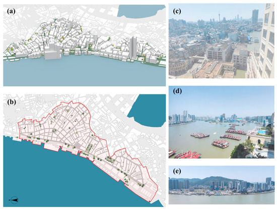 Study area: Macau Peninsula Pier district waterfront. The red line in the figure is the study area. (a) Three-dimensional model; (b) planar layout; (c) view of the densely populated urban area outside from the Ponte 16 Resort Hotel in Macau; (d) there are still ships docked in the waterway of Macau Peninsula Pier district; (e) view of Zhuhai Wanzai to the west from Macau Peninsula Pier district (image source: drawn by the authors).