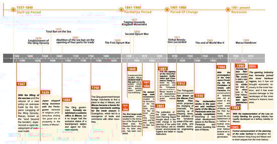 In the past, Macau’s domestic shipping could reach ports along the southwestern coast of Guangdong and Guangzhou, and its land and water transportation was quite convenient. It had the geographical advantage of “internal and external connections, external and internal connections” as a trade transit point and was an important node in the international trade network at that time. Since the beginning of the 16th century, the Portuguese began to gradually demonstrate their business management characteristics in Macau. The historical development and evolution of the Macau Peninsula pier district, as shown in Figure 3, records the four historical periods of this area, from its initial stage to its decline, as well as the major events with far-reaching impact that occurred in each historical period.
