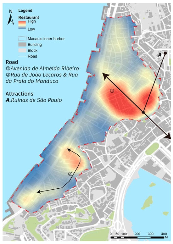 Kernel density analysis of the spatial layout of catering facilities in Macau’s Inner Harbour. (Image source: drawn by the authors).