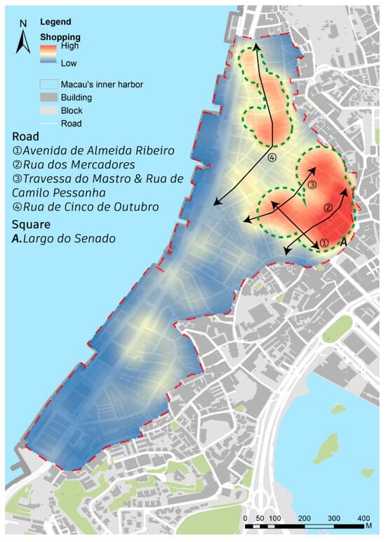 Kernel density analysis of the spatial layout of shopping facilities in Macau’s Inner Harbour. (Image source: drawn by the authors).