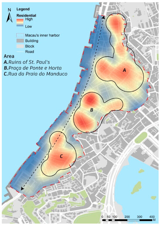 Kernel density analysis of the spatial layout of residential facilities in Macau’s Inner Harbour (Image source: drawn by the authors).