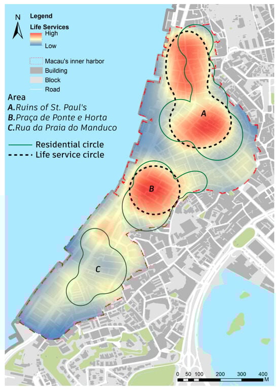 Kernel density analysis of the spatial layout of life service facilities in Macau’s Inner Harbour. (Image source: drawn by the authors).