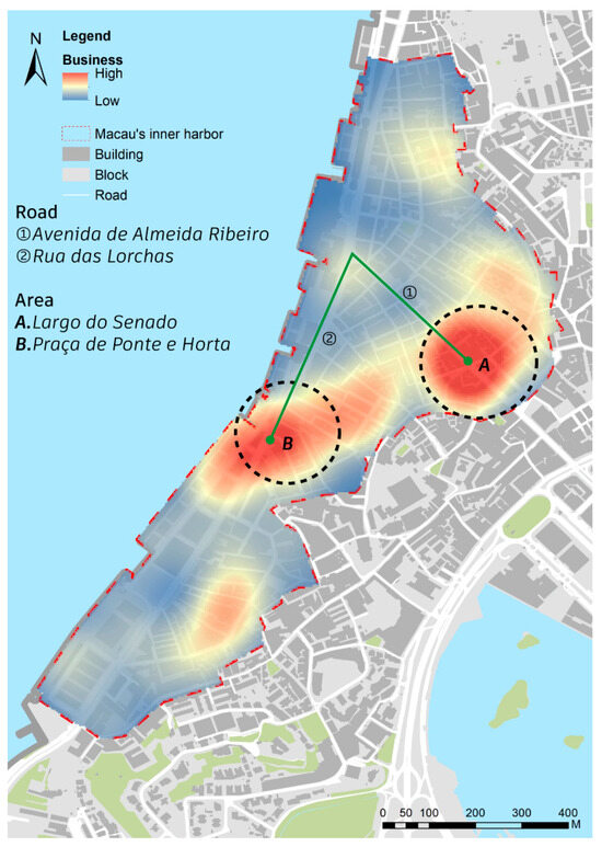 Kernel density analysis of the spatial layout of commercial facilities in Macau’s Inner Harbour. (Image source: drawn by the authors).