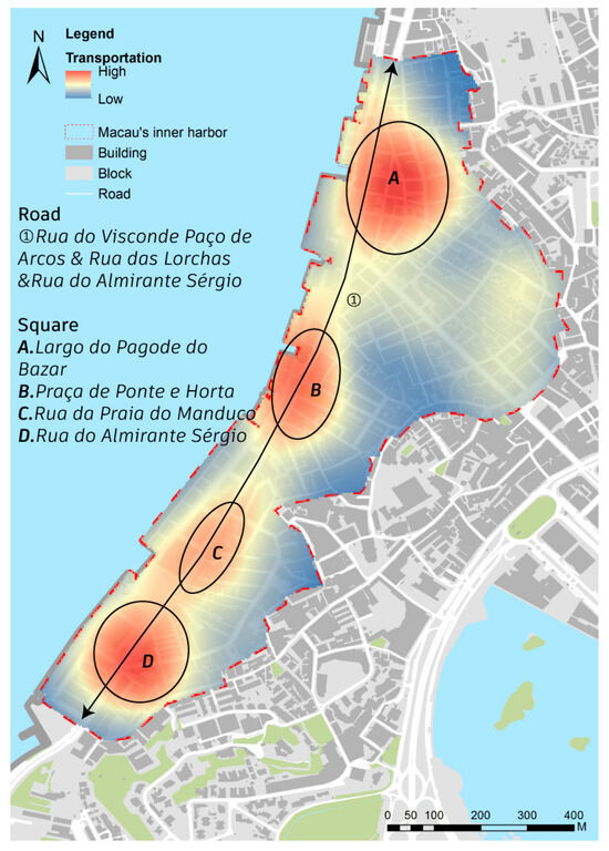 Kernel density analysis of the spatial layout of transportation facilities in Macau’s Inner Harbour. (Image source: drawn by the authors).