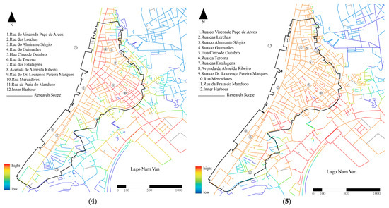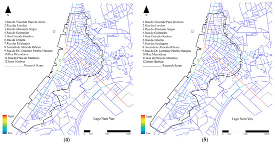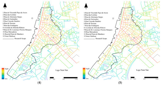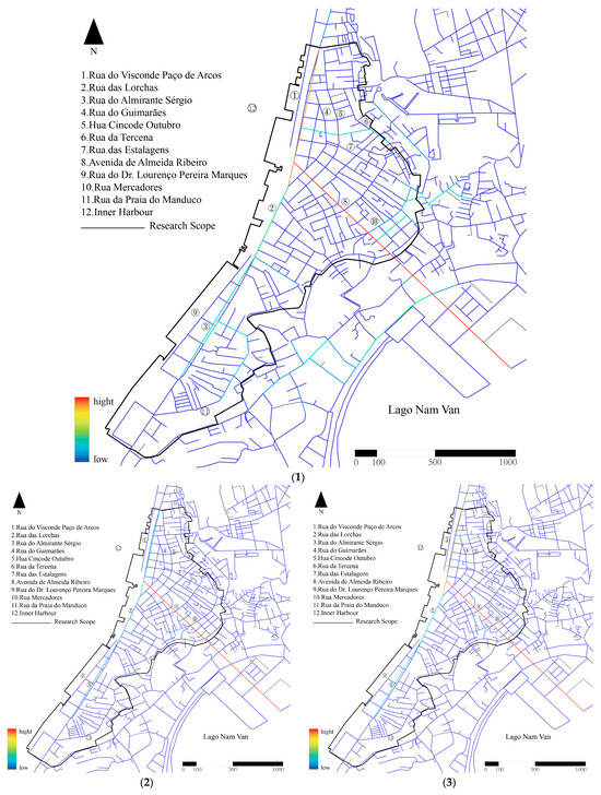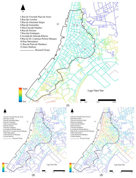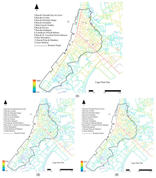 The results of the integration analysis of Macau’s Inner Harbour are shown in Figure 11 below and show the following characteristics: (1) In global integration, the core integration is the Pier 16 area near the sea in the north, and gradually decreases with this area as the center. Therefore, for large-scale travel by car, the most connected areas are usually the two main roads in the northern Inner Harbour, Rua das Lorchas, Rua do Visconde Paço de Arcos, Avenida de Almeida Ribeiro, and Rua do Almirante Sérgio, followed by Rua de Cinco de Outubro (十月初五日街) and Rua do Guimarãe (海邊新街), highlighting the important role of Macau Inner Harbour as a transportation center. (2) In the local integration of a radius of 300 m, as a destination for walking travel, the overall integration is relatively strong, and the area with the highest accessibility is near Avenida de Almeida Ribeiro. Secondly, the Paço de Arcos Street in the northern area connects multiple roads and has the second highest integration. Overall, the area near the two main roads in the Inner Harbour of Macau is a relatively ideal area within a from 3 to 5 min walking distance. (3) In the local integration within a radius of 500 m, the overall integration has improved, and the integration of the northern area has improved significantly, indicating that the northern area has good spatial permeability whether in a short walk of from 3 to 5 min or a short walk of from 5 to 10 min. (4) There is no significant difference between the radii of 1000 m and 1500 m in terms of integration. This indicates that the spatial structure of the Inner Harbour has strong stability and coherence under these two scales, and the local spatial connection patterns and interaction relationships do not fluctuate significantly due to the moderate change in the radius. (5) In the local integration within a radius of 1500 m, it is like global integration. In summary, the core integration of the Inner Harbour is concentrated near Pier 16 and the northern area. Among them, the two main roads have better accessibility for motor vehicle travel, and the northern part of the Inner Harbour has better accessibility for long and short-distance walking, while the area near Rua da Praia do Manduco has the worst accessibility.