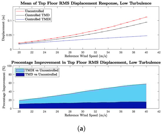 Figure 8 shows that the TMDFI consistently outperforms the TMD in reducing peak acceleration across all turbulence cases. However, the percentage of improvement decreases with increasing wind speed for both control systems. This decline is not uniform, with the TMDFI experiencing a more pronounced drop in performance, particularly at higher turbulence intensities. The magnitude of this degradation is detailed in Table 6, where the TMDFI shows greater sensitivity to increased turbulence.