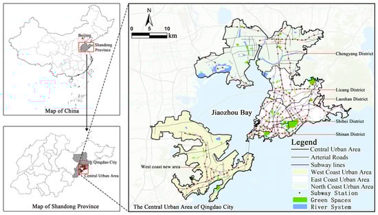 Considering the distribution of underground commercial spaces and the current development status of each district, this study focuses on the central urban area of Qingdao (Figure 1). According to the “Qingdao City Spatial Planning (2021–2035)”, the central urban area comprises the east coast urban area, the west coast urban area, and the north coast urban area. This region connects the city’s north–south coastal development axis and concentrates the urban functions of the Bay Area Metropolitan Area. It is the most densely populated area in Qingdao and hosts 88% of the city’s underground commercial facilities, serving 47% of its permanent residents.