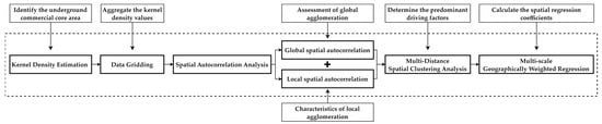 This study applies kernel density estimation to identify the core areas of underground commercial zones, with grids summarizing kernel density values serving as geographical analysis units. Based on this, spatial autocorrelation analysis is conducted to assess the global and local agglomeration characteristics of underground commercial activities. The scale of agglomeration for underground commercial activities is determined using the multi-distance spatial clustering function. Subsequently, influencing factors are selected, and the geographical detector method is employed to identify the dominant driving factors. Finally, the MGWR model is utilized to calculate the spatial regression coefficients of the influencing factors, thereby analyzing the spatial heterogeneity of underground commercial activities and their relationship with each influencing factor (Figure 2).