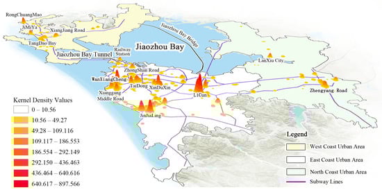- From a zoning perspective, the east coast urban area features larger high–high clustering areas, where the distribution of underground commercial spaces aligns closely with surface commercial layouts and metro line directions. In the west coast urban area, underground commercial spaces are primarily concentrated along Metro Line 1 and in the JiMiYa business district. In the north coast urban area, only the Zhengyang Road business district contains a relatively concentrated underground commercial space.