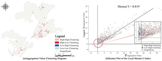 Based on the global spatial autocorrelation analysis, the Local Moran’s I was calculated to conduct a local spatial autocorrelation analysis. Cluster analysis reveals that the predominant clustering pattern is high–high clustering, with low–high clustering being the primary outlier type. No high–low or low–low clustering areas were identified. Additionally, the scatter plot of the Local Moran’s I exhibits a positive slope, indicating a positive spatial correlation in the density distribution of underground commercial spaces (Figure 4). Based on these findings, the following conclusions can be drawn:
