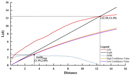Ripley’s K function is typically used in cluster analysis. This method determines the distribution patterns of point features in space at different scales by comparing the observed values and expected values at specific distances [,,]. During the calculation of Ripley’s K, multiple Monte Carlo simulations [] are employed to generate a confidence interval with a confidence level of 99%, quantifying the critical scale at which point features are aggregated or dispersed. The calculation formula is as follows: