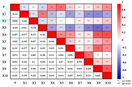 The Pearson correlation coefficient method was employed to examine the correlation between the underground commercial space agglomeration value (Y) and the influencing factors (×1–×10). The results (Figure 6) indicate that the underground commercial space agglomeration value is significantly correlated with all ten influencing factors. Specifically, it exhibits significant positive correlations with road network density, commercial supporting facilities, development of underground space, ground development intensity, shop rent, land cost, permanent resident population density, and population heat value, with correlation coefficients of 0.045, 0.497, 0.565, 0.193, 0.074, 0.094, 0.254, and 0.452, respectively. Notably, the highest correlation coefficient (0.565) is observed for development of underground space. In contrast, the agglomeration value of underground commercial space exhibits a significantly negative correlation with proximity to the nearest subway station and central business districts, with correlation coefficients of −0.112 and −0.165, respectively. The negative correlation suggests that as the distance from the nearest subway station and major commercial areas increases, the distribution of underground commercial space becomes more dispersed. This indirectly verifies the critical role of subway accessibility and central location in promoting the agglomeration of underground commercial space.
