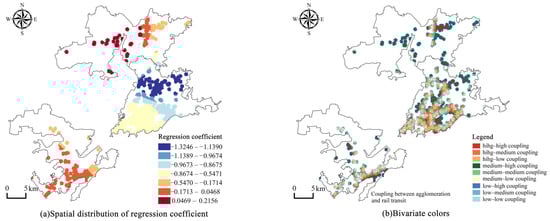 The spatial distribution of the regression coefficient and the bivariate color plot for rail transit.