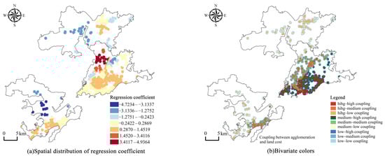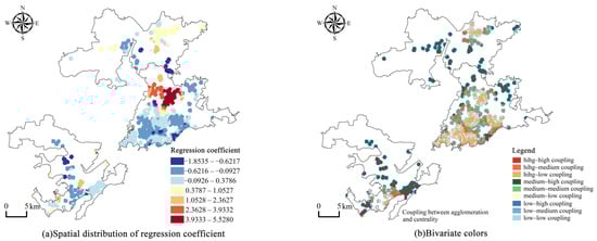 The influence coefficient of commercial supporting facilities ranges from −0.8758 to 5.2304. The regression coefficient reaches its peak in the LiCun business district of the eastern urban area. In this district, the underground commercial space agglomeration value and commercial supporting facilities exhibit a “high-high” coupling relationship. The spatial distribution of underground and above-ground commercial spaces demonstrates consistency, with commercial supporting facilities significantly promoting the agglomeration of underground commercial spaces. Moving southward or northward from the LiCun business district, the regression coefficient gradually decreases, indicating a weakening driving effect of commercial supporting facilities. Nevertheless, the coupling relationship between the underground commercial space agglomeration value and commercial supporting facilities remains predominantly “high-high” (Figure 9). Overall, there is a positive correlation between commercial facilities and underground commercial agglomeration. Regions with high ground-level commercial density tend to develop underground commercial agglomeration zones more readily. Nevertheless, in most areas, underground commercial activities remain non-independent business forms, relying on the development of above-ground commercial activities. As above-ground commercial activities exhibit a circular distribution pattern, underground commercial activities similarly demonstrate this characteristic but within a smaller spatial range.
