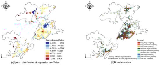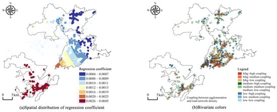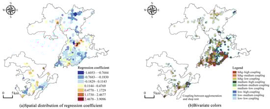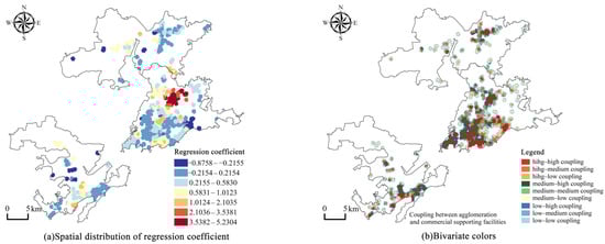 The spatial distribution of the regression coefficient and the bivariate color plot for commercial supporting facilities.