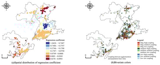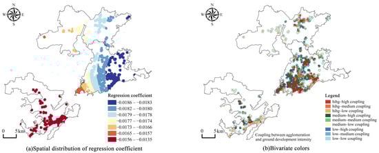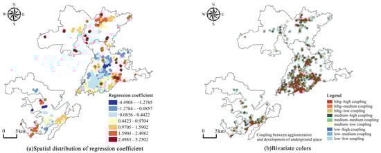The regression coefficients of each explanatory variable are spatially visualized, and the values of underground commercial space agglomeration are mapped one-to-one to the values of each explanatory variable in the form of bivariate color zoning maps.