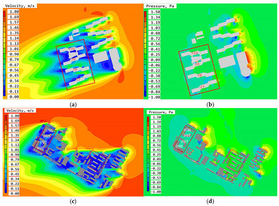 Wind Speed and Wind Pressure Contour Maps at Pedestrian Height of Plate-Type Multi-Story Building. (a) Plate-type multi-story wind speed cloud map of the new campus of CHD. (b) Plate-type multi-story wind pressure cloud map of the new campus of CHD. (c) Plate-type multi-story wind speed cloud map of XD new campus. (d) Plate-type multi-story wind pressure cloud chart of XD new campus.
