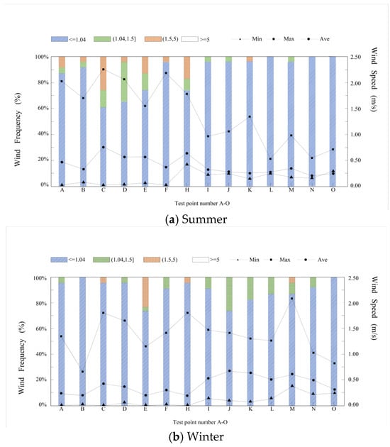 The multi-story buildings in the eastern area of the new campus of CHD and the multi-story buildings on the new campus of XD were measured on 10 January 2024, and 28 June 2024, respectively. Measurement points were placed at key locations, including the windward and leeward sides, the spaces between adjacent buildings, and at the building corners, to ensure comprehensive data collection. The test instruments used were the TES-1341 hot-wire anemometer (accuracy: ±3% of reading ±0.1 m/s) and the Testo 410-1 impeller anemometer (accuracy: ±1.5% of reading ±0.2 m/s), as shown in Figure 2. Wind speed measurements were conducted from 8:00 a.m. to 7:00 p.m., with data recorded every 0.5 h. The measured results for the eastern area of the new campus of CHD are presented in Figure 3.